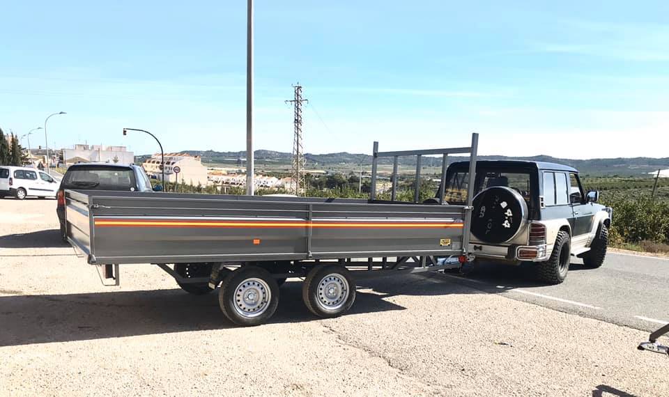 Remolque todoterreno basculante hidraulico manual , equipado con 1 eje con freno y ruedas todoterreno